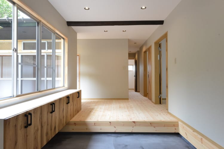玄関入った瞬間にハッとする素敵空間。南側に玄関が位置するのと明るめの無垢フローリングを使っているので明るく温もり感じる玄関ホールになっています。