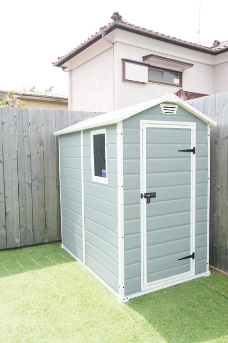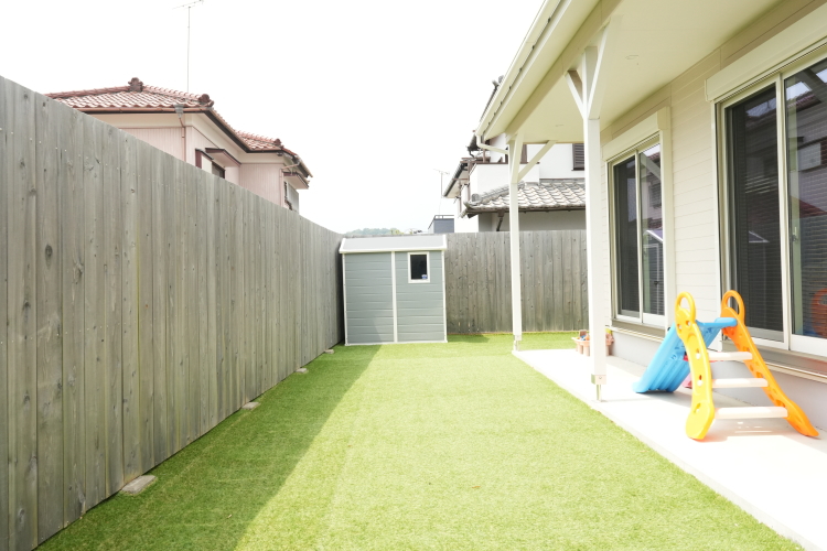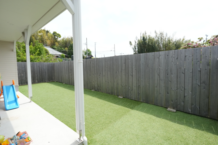 明るく開放的なお庭。人工芝になっています。また、目隠しウッドフェンスがあるので、1階からは墓地は殆ど見えません。