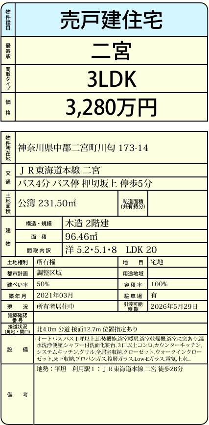 【二宮町川匂173-14・二宮駅バス4分停歩5分・土地70坪・2021年3月建築・96.46㎡・3LDK・価格3,280万円】