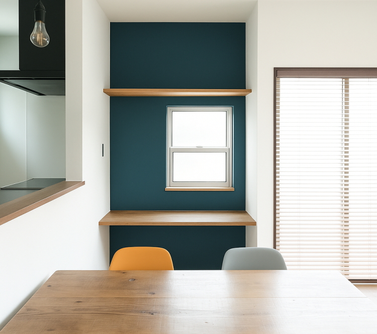 キッチン横に設けられたカウンタースペースは、家族にも個人にも使いやすい機能的でおしゃれなワーク&スタディコーナーとして非常に魅力的です。