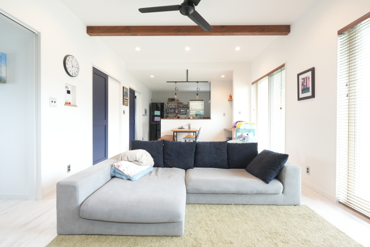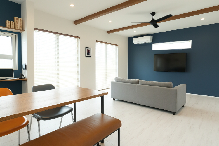 南からの陽光が心地よく差し込む、開放感あふれるリビング空間。木の温もりとモダンなデザインが融合したおしゃれな住まいです。