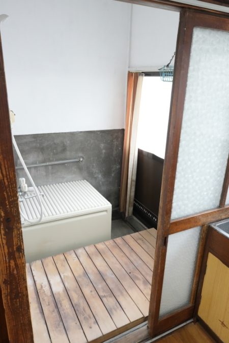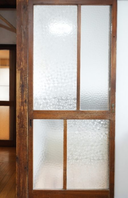 お風呂のガラス戸。年月を重ねた木枠の質感と模様ガラスが、もはやアンティークの様。