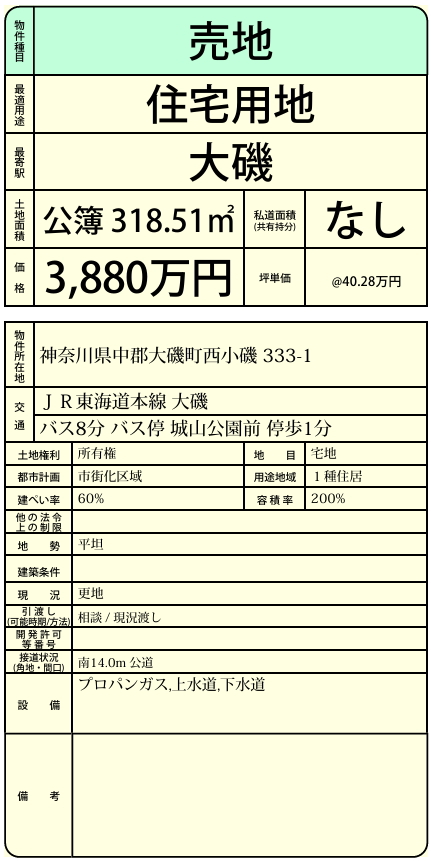 【大磯町西小磯333-1・大磯駅バス8分停歩1分・318.51㎡(96.34坪)・価格3,880万円】
