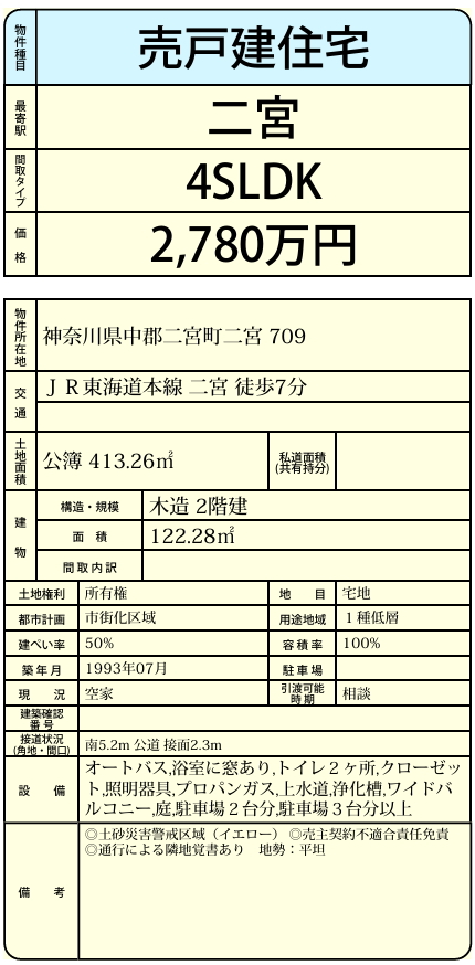 【二宮町二宮709他・二宮駅徒歩7分・土地125坪・平成5年建築・4SLDK・122.28㎡・価格2,780万円】