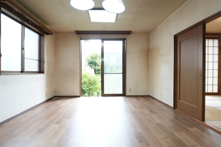 南向きの窓から優しい日差しが差し込む、明るいリビングダイニング。庭の緑がちょうど目線の先に見え、季節ごとの変化を感じられます。R7年9月にはリビング床の新規貼り替え工事が完了しており、木目の美しいフローリングが空間をすっきりと見せています。隣には続き間の和室があり、引き戸を開ければさらに開放的な空間に。