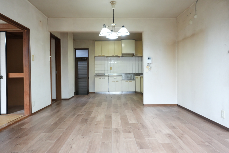 南側からの光が奥のキッチンまで届き、全体が柔らかく明るい雰囲気に包まれています。キッチンは壁付タイプで動線もシンプル。ダイニングテーブルを置いてもゆとりがあり、家族との時間を自然に楽しめる空間です。