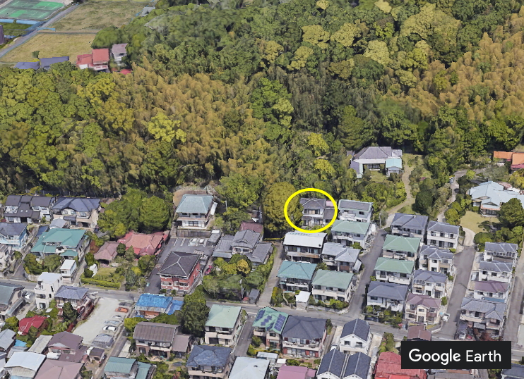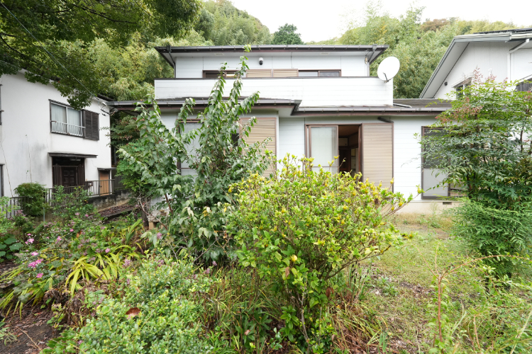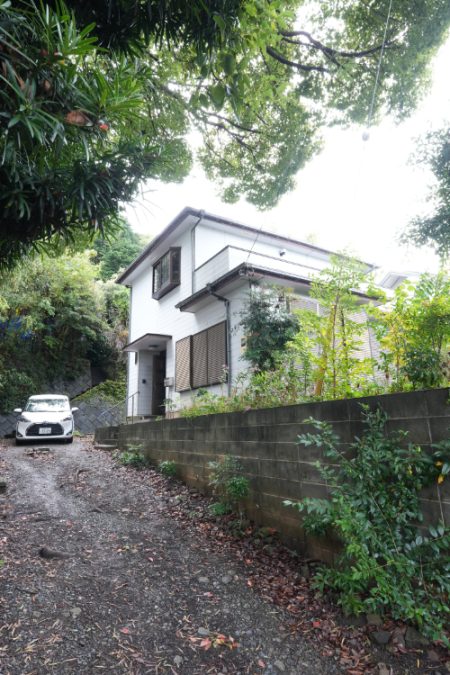 写真で見てわかる通り、この家の背後には豊かな緑が広がっています。ただし「高台の山の上」ではなく、二宮駅から平坦な道のりで徒歩約7分という利便性も兼ね備えています。