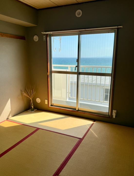 畳に腰を下ろすと、まるで絵画のように海を切り取った景色が広がります。畳の香りと潮風が重なり、都会では味わえない贅沢な癒し空間に。