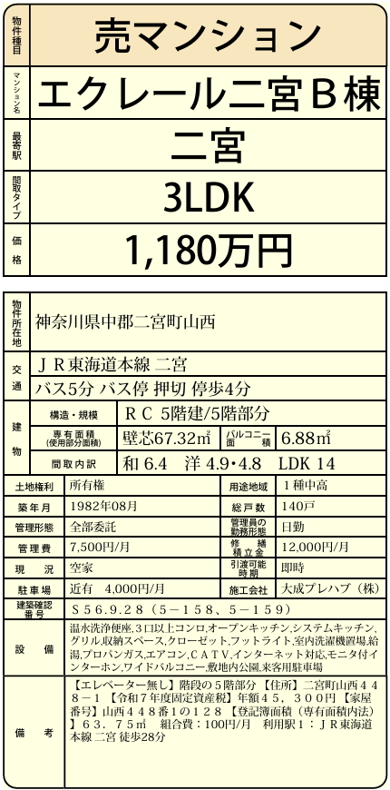 【二宮町山西448-1・二宮駅バス5分停歩4分・1982年建築・3LDK・67.32㎡・価格1,180万円・管理費7,500円・修繕積立金12,000円】