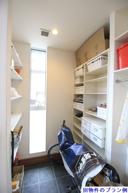 玄関脇には、ゆとりあるシューズクロークを設置。靴だけでなく、ゴルフバッグやベビーカー、アウトドア用品も収納できる広さです。