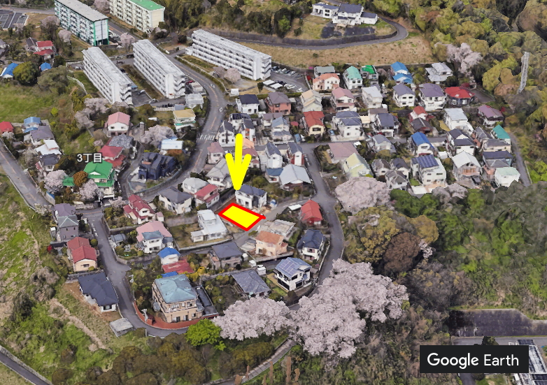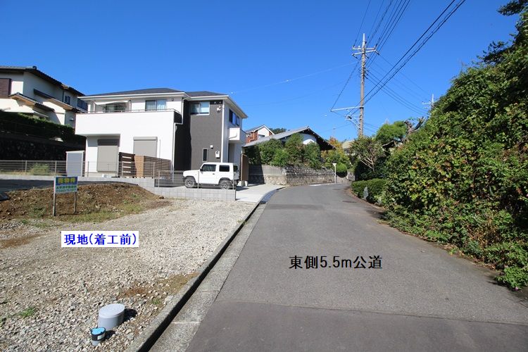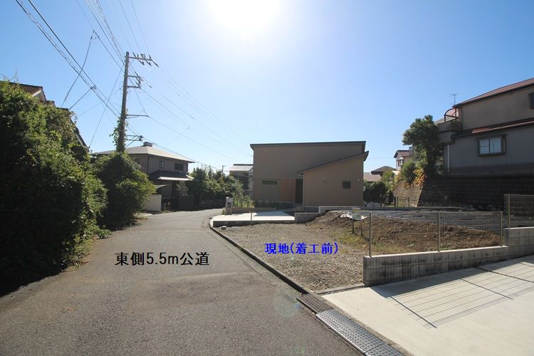 現地は南向きで陽当たり良好。周囲には新しい住宅が立ち並び、静かで落ち着いた住環境です。前面道路は幅約5.5mの公道で、車の出し入れもスムーズ。