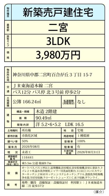 【二宮町百合が丘3-15-7・土地166.24㎡(50.28坪)・2026年8月完成・166.24㎡・3LDK・価格3,980万円】