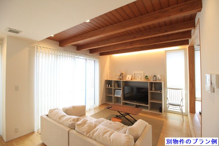 完成後は、写真のような木のぬくもりを感じる勾配天井リビングを予定しています。天井の梁を見せるデザインは、空間に立体感と温かみをプラス。