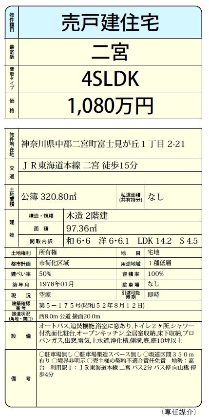 【二宮町富士見が丘1-2-21・二宮駅徒歩15分・土地97坪・1978年建築・97.36㎡・4SLDK・価格1,080万円】
