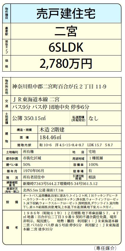 【二宮町百合が丘2丁目・土地105坪・1970年建築・184.46㎡・6SLDK・価格2,780万円】