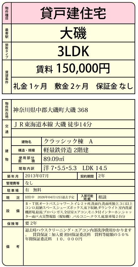 【大磯町大磯・大磯駅徒歩14分・2013年建築・89.09㎡・3LDK・家賃15万円・敷2礼1】